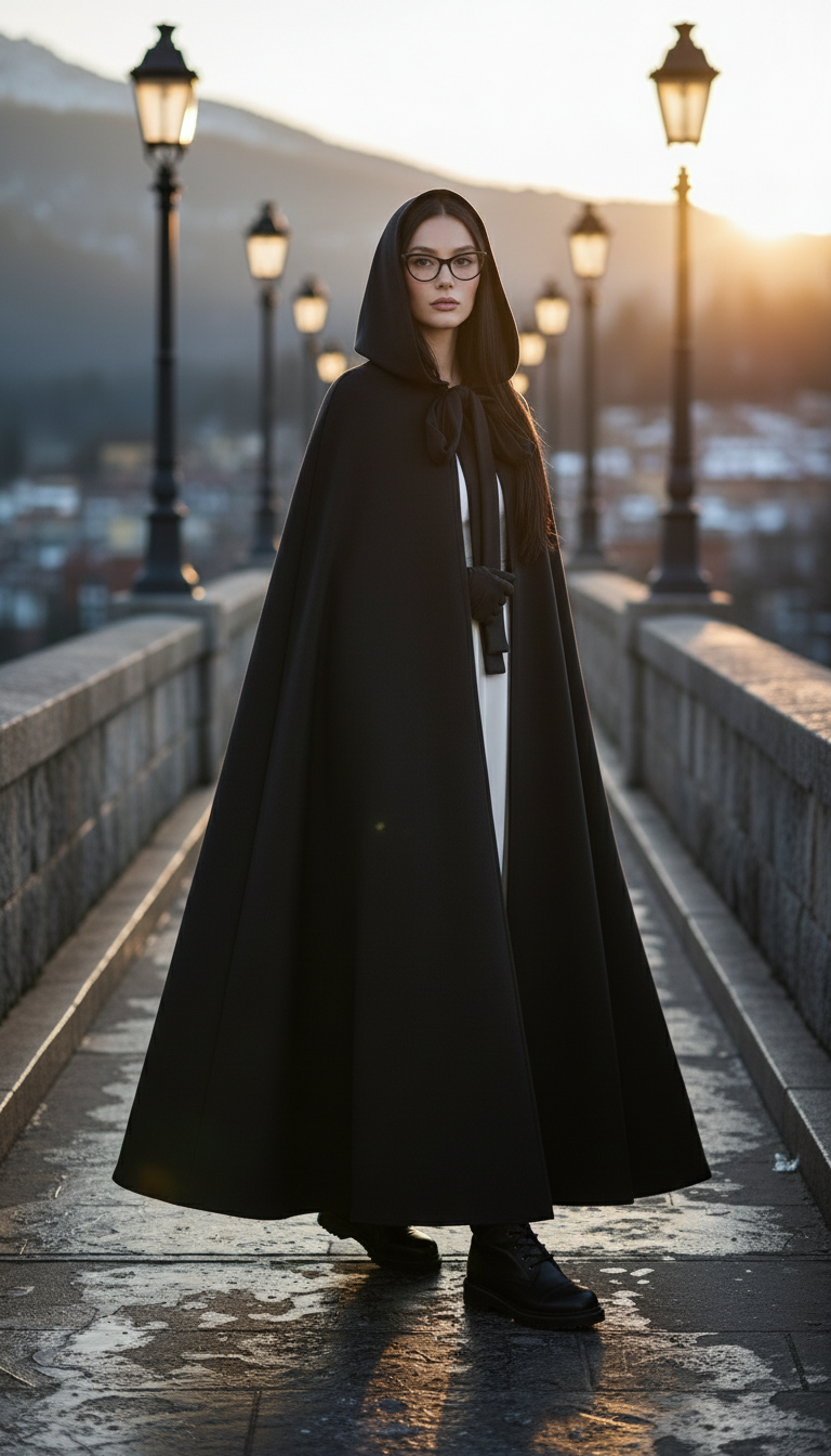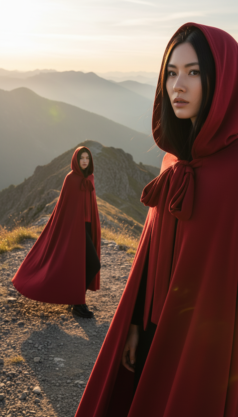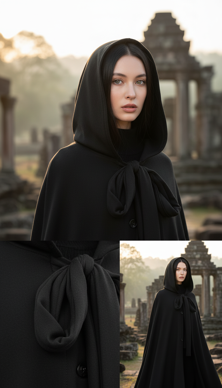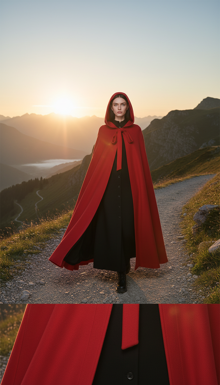 An elegant cape made from luxurious Dura/Chamois fabric, available in red and black. Featuring a royal, long design with a front opening, a neck tie, and a large hood, this cape adds a touch of sophistication to your look. It’s spacious and extra-long, perfect for layering over any outfit, giving you a regal appearance like no other.